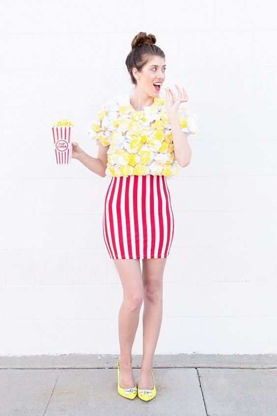 Für den Feinschliff braucht ihr noch eine rote Strumpfhose, weiße Sneakers, eine Herz-Sonnenbrille, eine rote Perrücke und die Popcorntütten (gefüllt mit Popcorn).