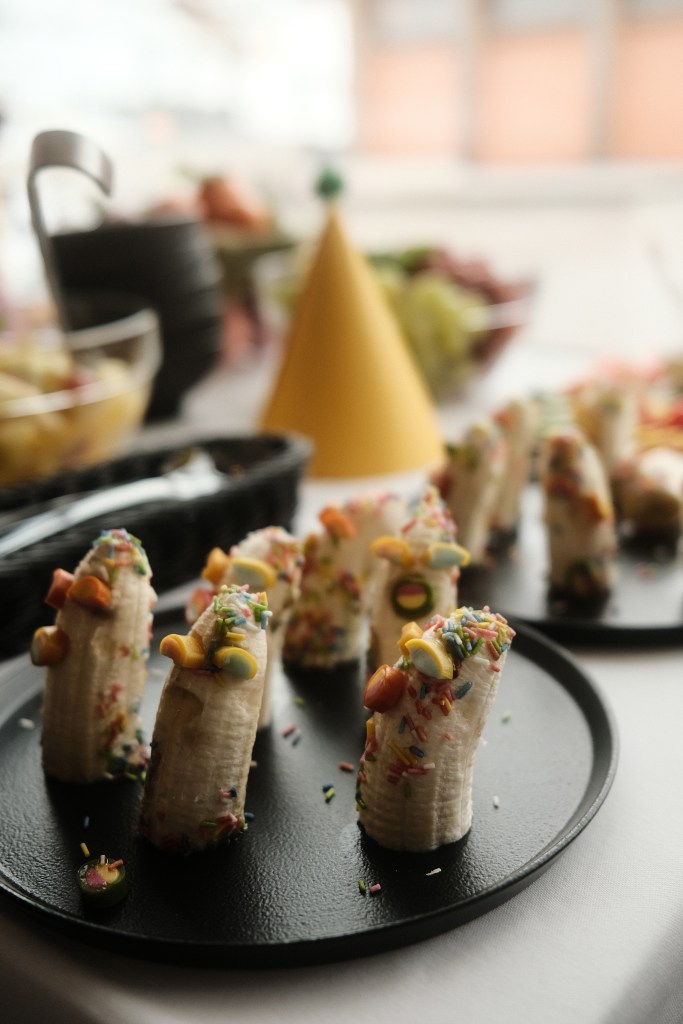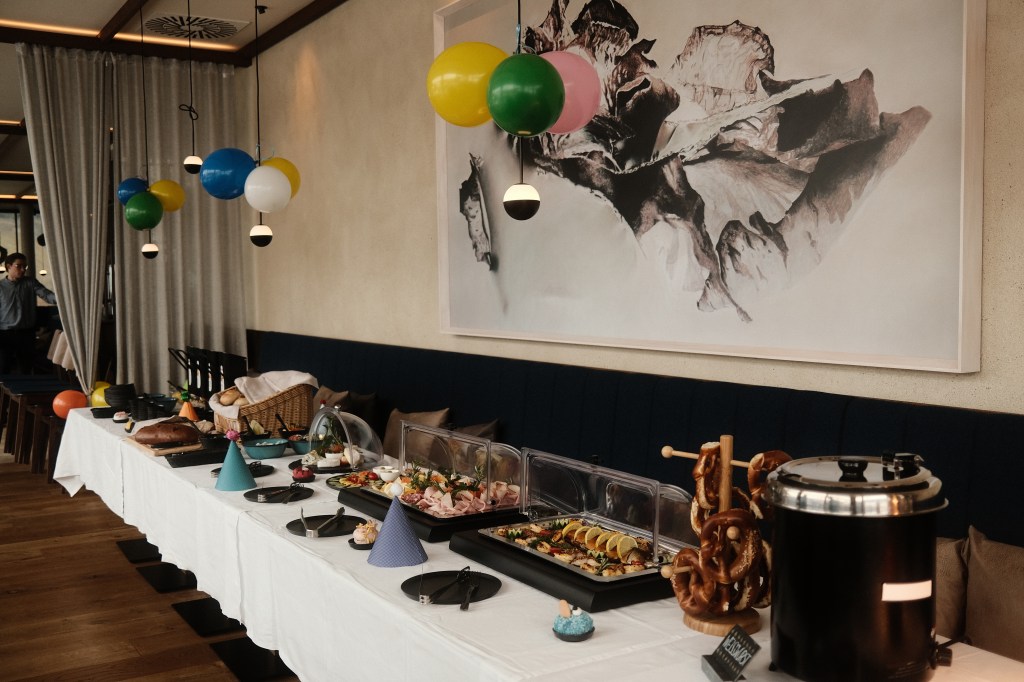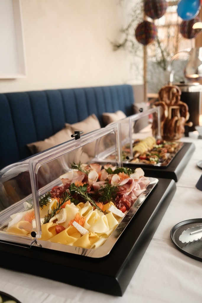 Unser Brunch fiel genau in die Faschingszeit. Das Buffet war bunt dekoriert und auch perfekt für einen Brunch mit Kindern, wie wir finden. Was bietet der Brunch? An der Getränkestation gibt es Kaffee, Tee, Kakao, verschiedene Fruchtsäfte und – ganz wichtig – Prosecco. Weiter geht es dann mit den kalten Frühstücksspeisen angefangen von Käse & Schinken, bis hin zu geräucherten Fisch, ausgefallene Aufstriche und Marmeladen. Es gibt vom Frühstücksbereich auch gekochte Eier, Spiegeleier mit Speck, Croissants und Joghurt mit Müsli & Obst.